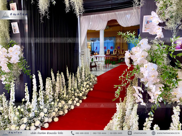 เบญจมาศ มัม คาร์เนชั่น เยอบีร่า กล้วยไม้ – สามารถเปลี่ยนสีดอกไม้ตามที่ต้องการได้ ดอกไม้อาจเปลี่ยนแปลงไปตามฤดูการ – อุปกรณ์ต่างๆเป็นการให้ยืมเพื่อจัดงานเท่านั้น นำกลับหลังเสร็จงาน – ทุกงานมัดจำงาน 30%